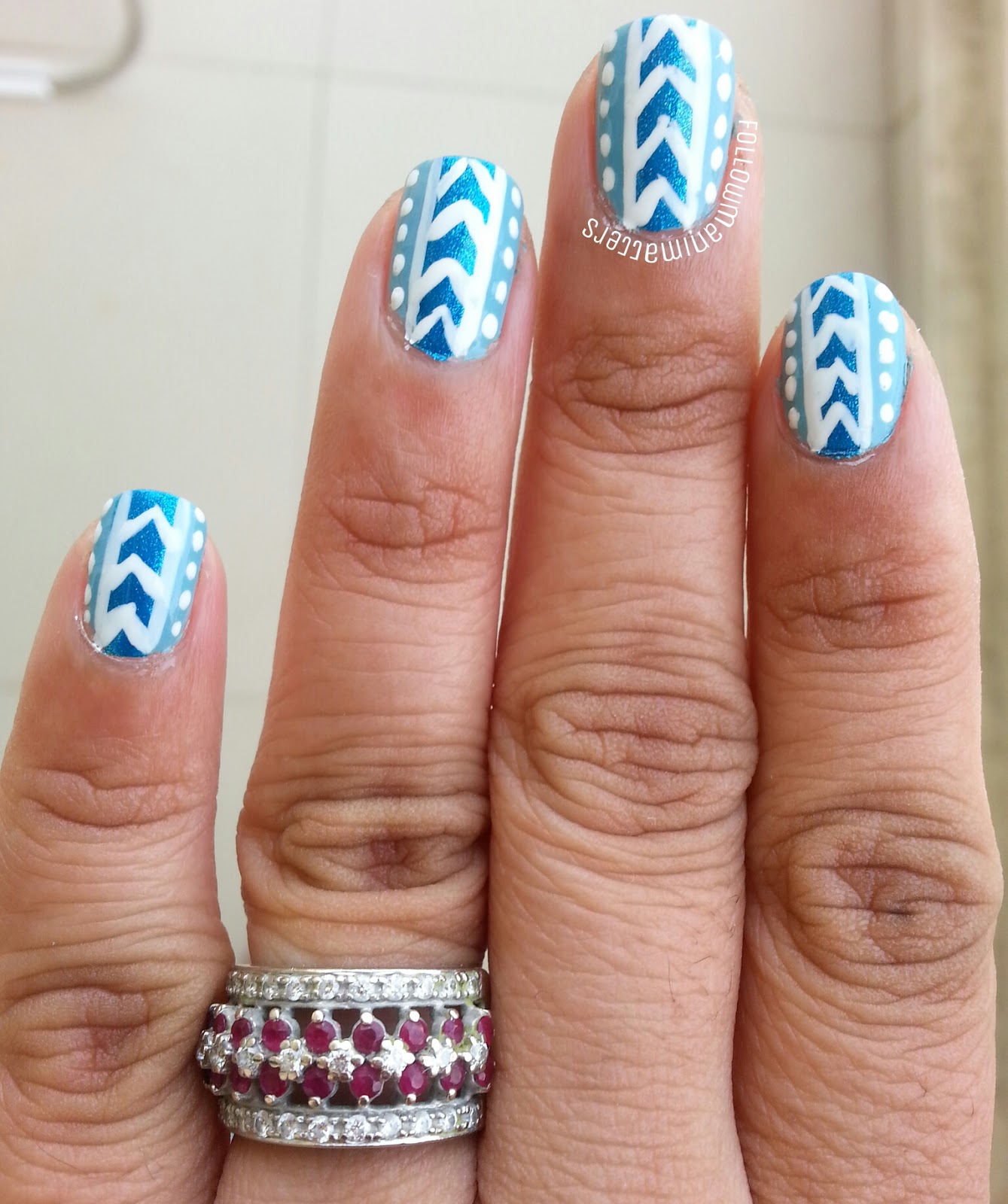 For this design, I used WnW I need refresh mint as base color and added lines with Kleancolor Aqua and white striper. You can check out pictorial tutorial below on how to make this pattern.